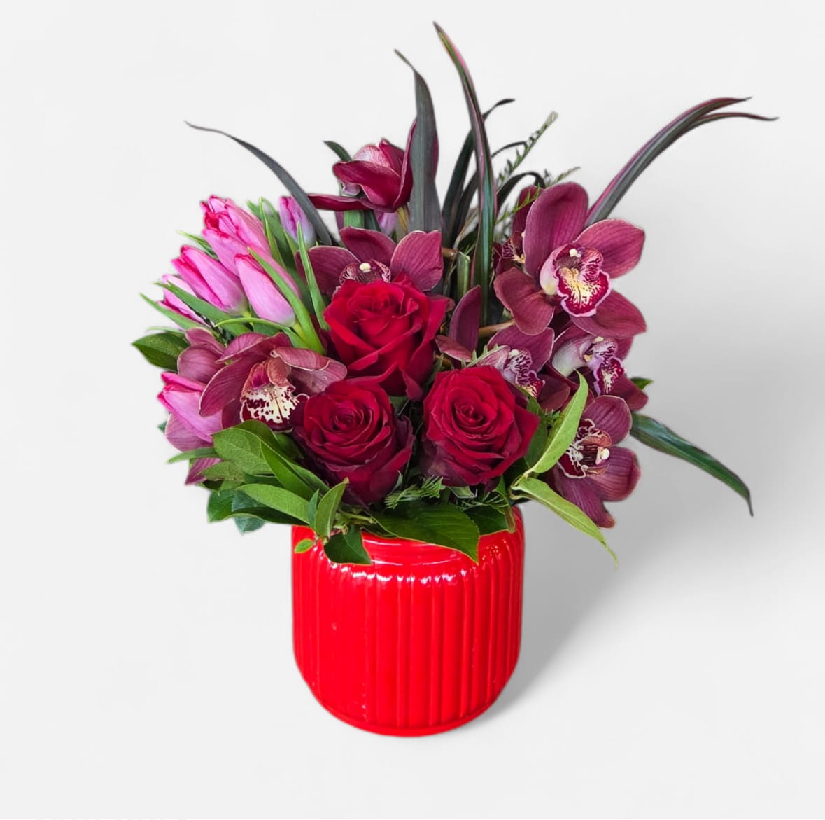 L'Amour Rouge is romantic, sophisticated, and designed to make a statement. Rich red roses, lush cymbidium orchids, and vibrant tulips come together in a red ceramic vase, creating an arrangement both modern and elegant. This design blends classic romance with a contemporary touch. Send L'Amour Rouge to celebrate love, passion, and heartfelt moments on Valentine’s Day.