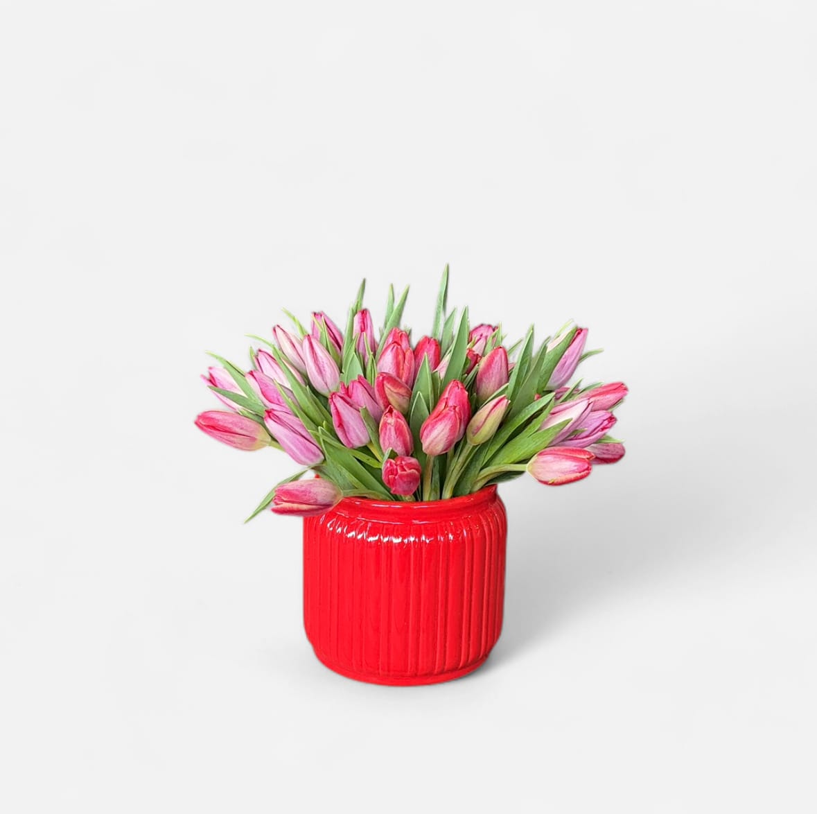 A timeless and graceful arrangement featuring vibrant pink and red tulips nestled in a bold red ceramic vase. Clean, modern, and effortlessly gorgeous, this design celebrates love in its purest forms. What a great way to show your Valentine or Galentine your love and appreciation.
