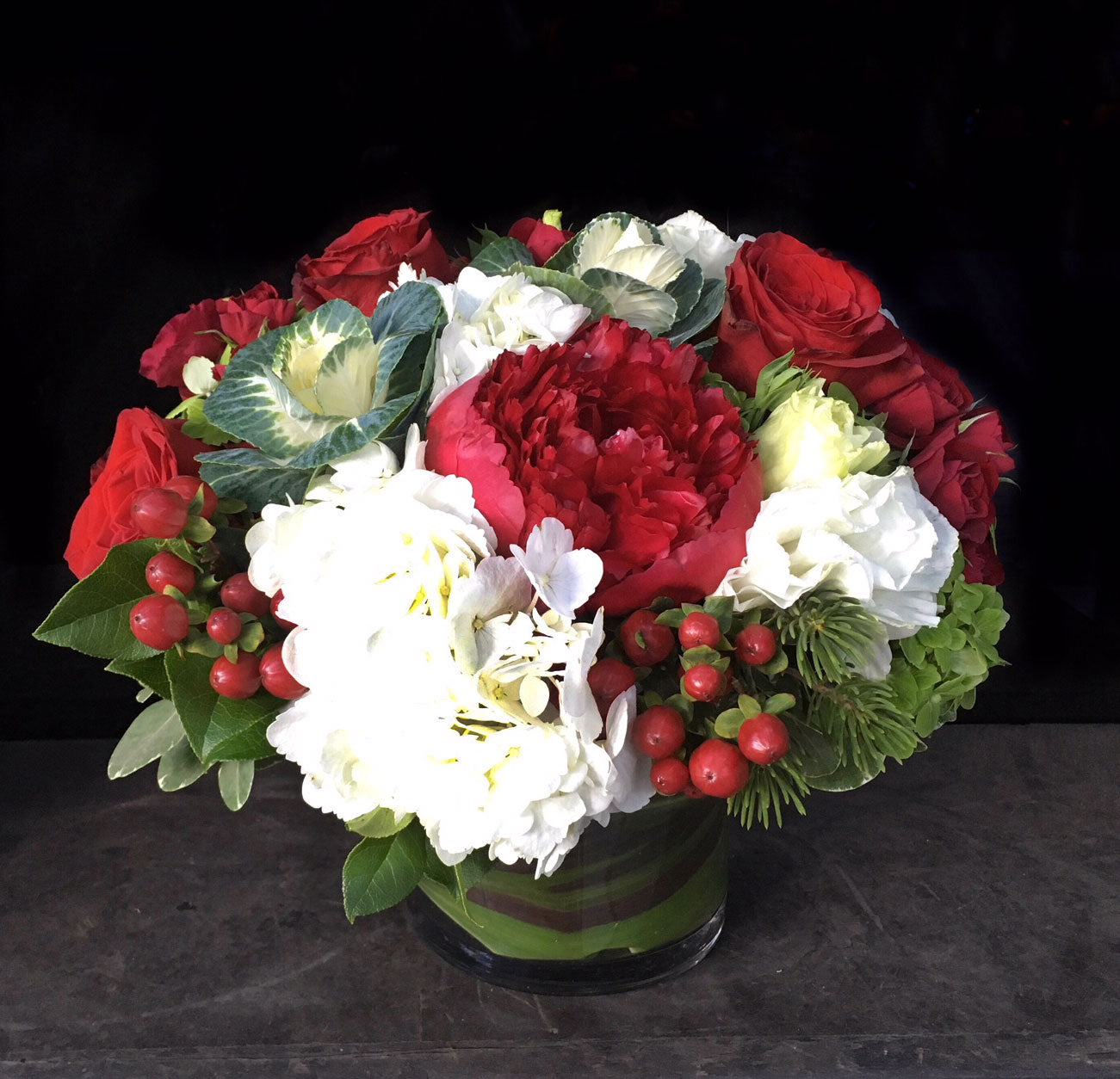 This seasonal red and white holiday centerpiece abounds with a red peony (if you choose deluxe) red roses, hydrangea, kale and hypericum berries for a great holiday gift delivered to your door.